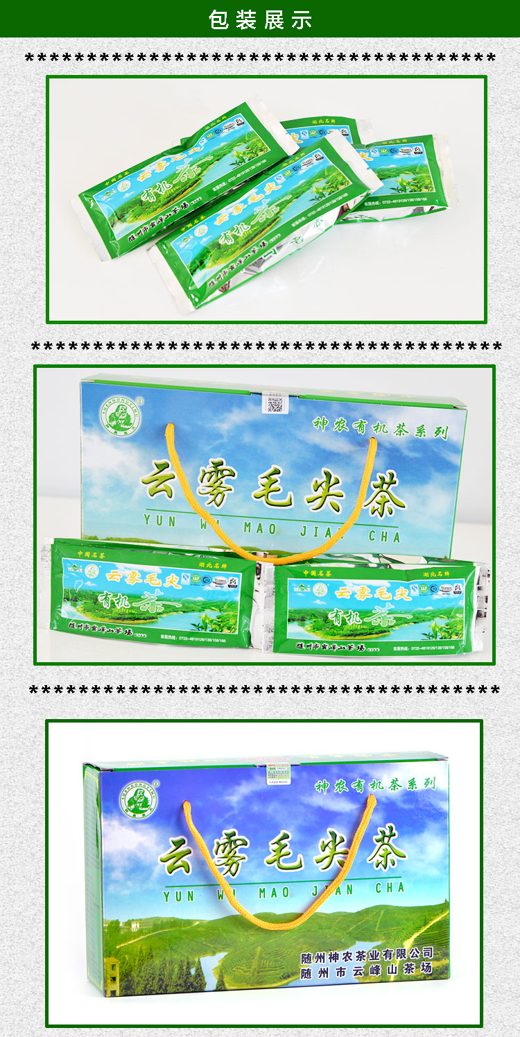 云霧毛尖茶外形緊結(jié)稍卷曲,茶毫顯露,湯色嫩綠明毫,香氣醇厚持久,滋味綿長回甘,葉底嫩綠明亮。自七十年代創(chuàng)制以來,已有近四十年歷史,深得消費(fèi)者好評,先后多次被評為“中國名茶”、“湖北省優(yōu)質(zhì)產(chǎn)品”,李先念主席曾于1988年將其作為國粹饋贈給保加利亞客人。